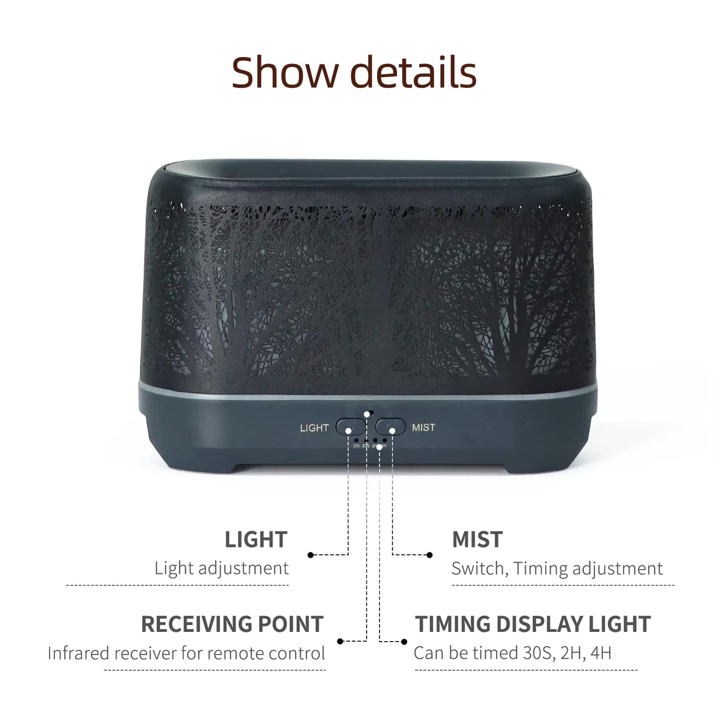 - Timer Mist Setting: This flame essential oil diffuser is rather simple to operate; press mist button that turns it on and the diffuser runs on continuous mist; push it a second time and it stays on for 1 hour; press it a third time and it stays on for 3 hours; press it a fourth time and it stays on for 5 hours; It will shut off automatically when the time is up.