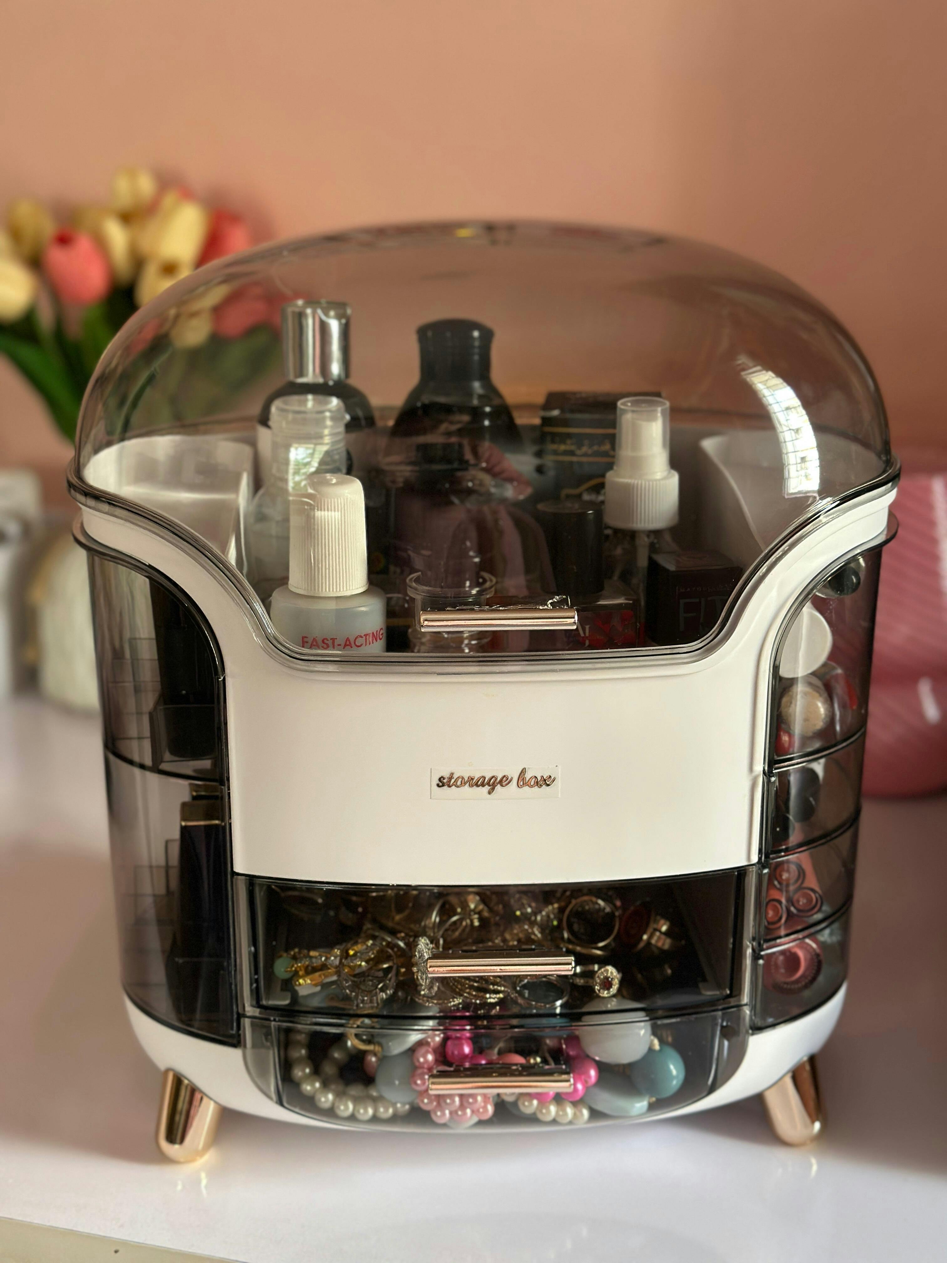 Upgrade your beauty space with this Elegant Multi-Layer Cosmetic Storage Organizer. Designed with a transparent dust-proof lid and multiple drawers, it keeps your makeup, skincare bottles, and beauty tools neatly arranged and easy to access. The sturdy, modern design with gold-accented legs adds a touch of luxury to any vanity or bathroom setup. Perfect for both home and salon use.